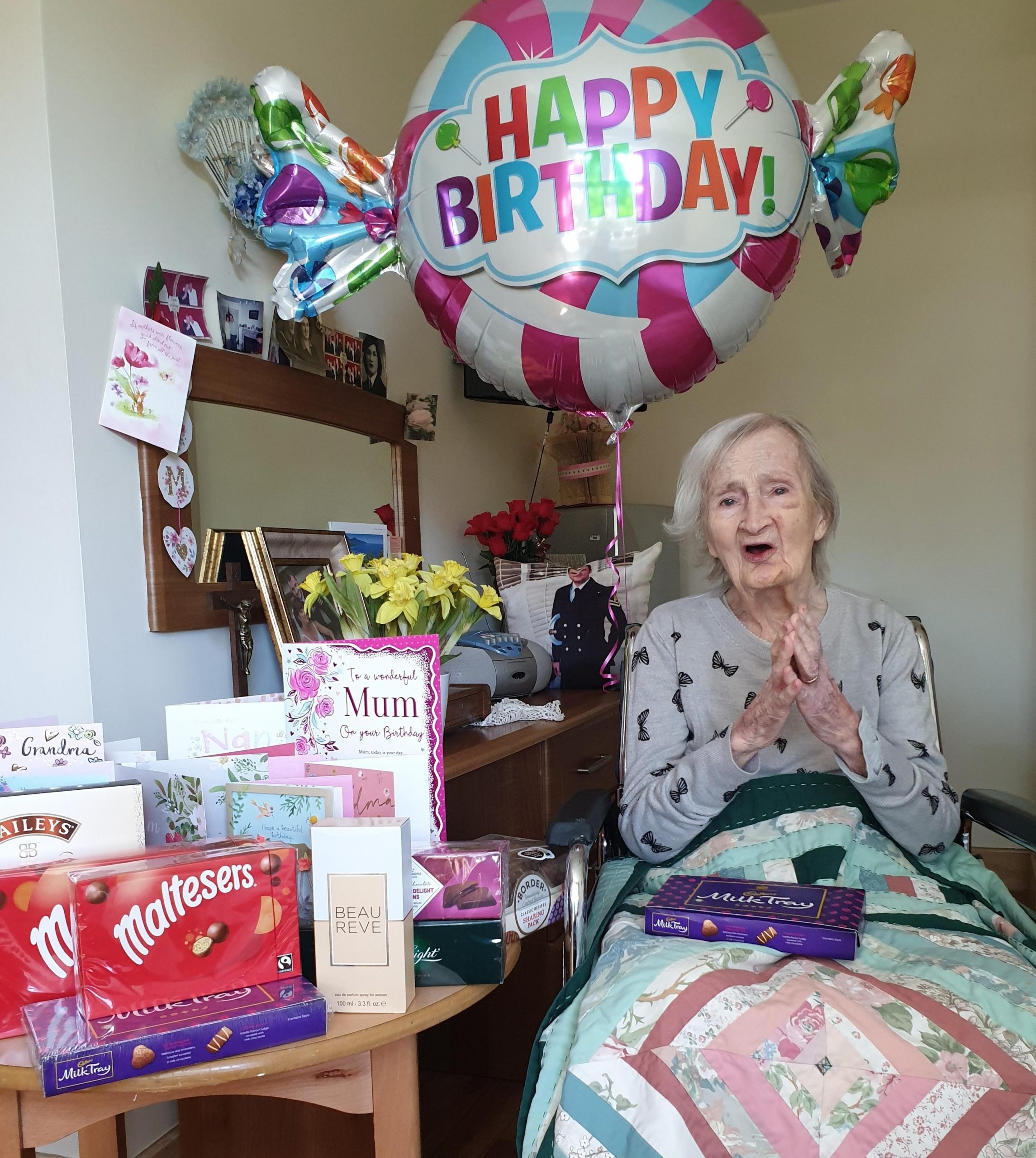Staff at Bruce Lodge pulled out all the stops to give Mary a memorable birthday, despite lockdown. Some of Mary’s family visited to sing happy birthday and wave to her from outside. Mary received lots of gifts and was treated to a large birthday cake and huge birthday balloon.